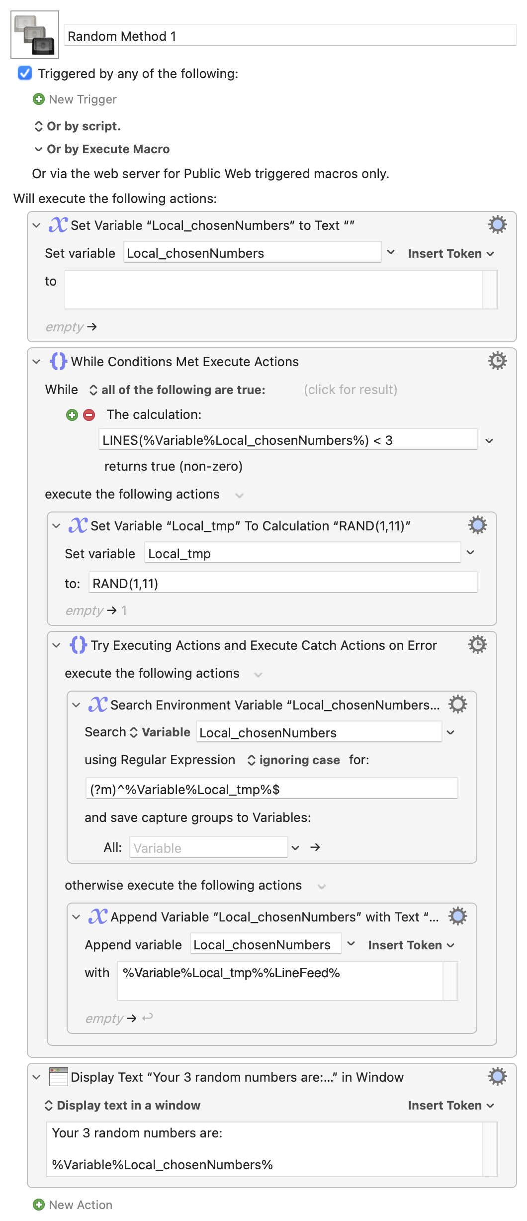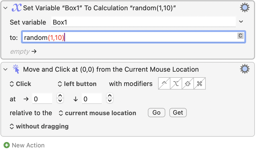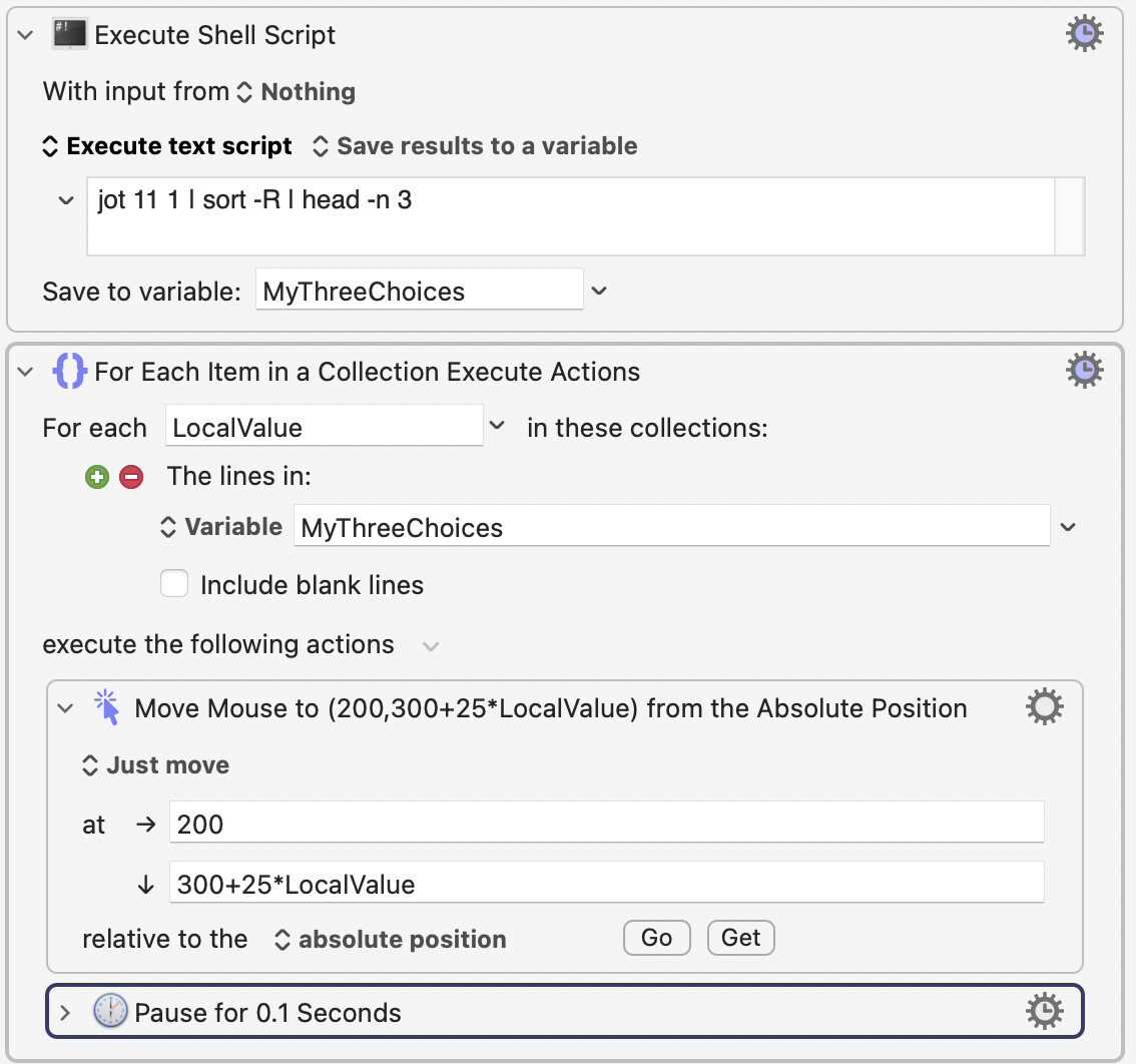 In one approach, which will generate three random numbers from 1 to 11, you don't just want three random numbers from 1 to 11, but you actually want three random DIFFERENT numbers from 1 to 11. If they weren't different, that would be a "bug" for you. Technically then, because they are different numbers, they aren't INDEPENDENTLY random. You want three different numbers from a set of 11. This is easy enough to solve, but I'm not sure if I have the shortest solution to that problem. My solution has two steps: (a) Generate three different random numbers from 1 to 11, (b) Use those three numbers to calculate click locations in a loop and click on those locations. With a brief pause, to be safe.