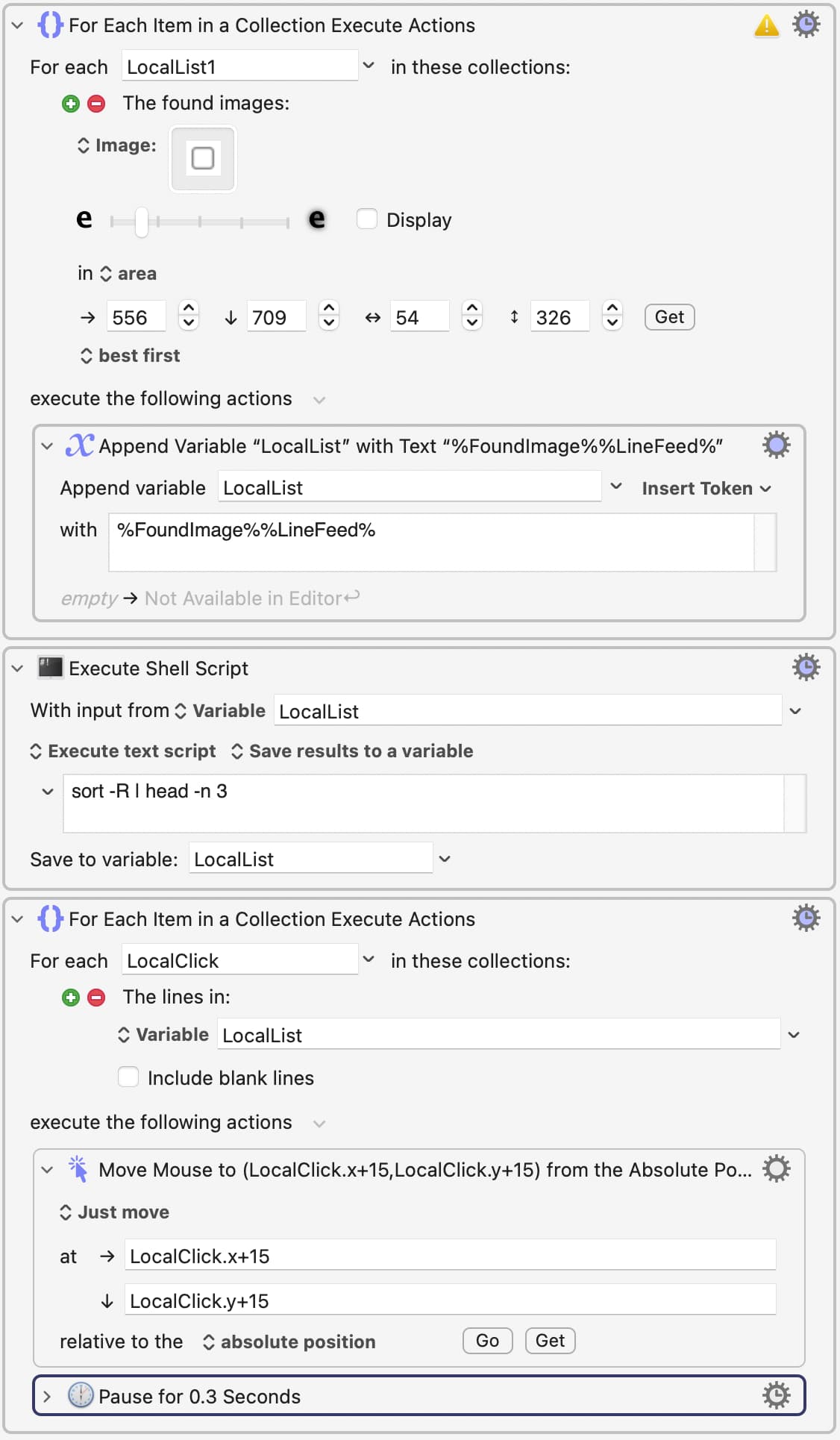 Thanks. I use macros that do this every day. In fact, I give higher probability to certain locations on the screen by adding multiple copies of the %FoundImage% data to the “accumulation variable” (which, in my example, is LocalList).