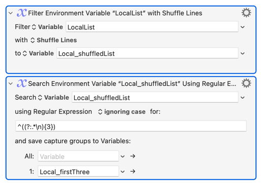 Welcome to the forum! I love problems like this, I know there are probably MANY ways to accomplish this, but one way to do it, is instead of using the random function, you could create a list of exactly 3 1's, and the rest 0's, and use the filter action to shuffle that list, and use the list as an array to set the checkbox state in the prompt.