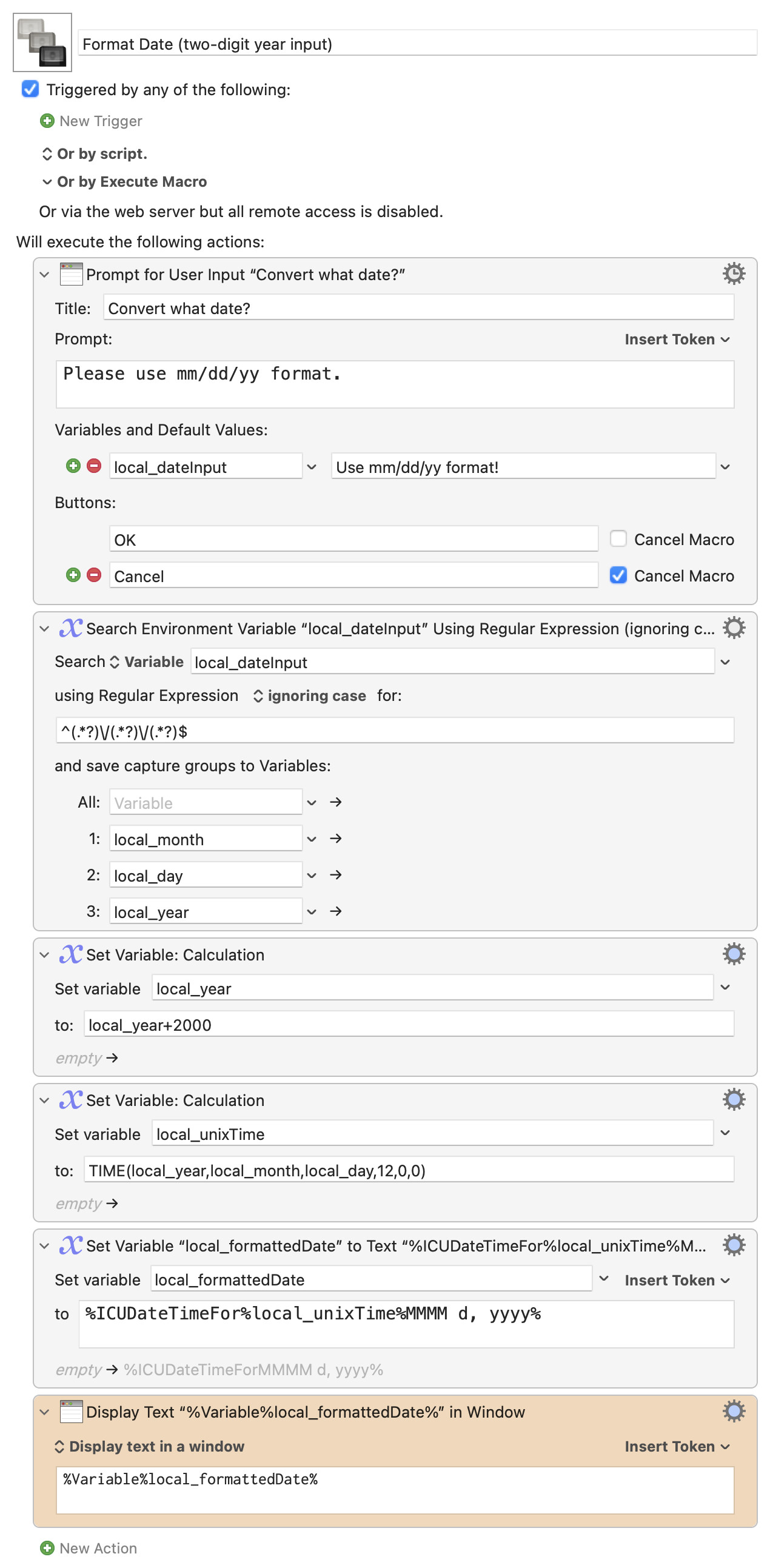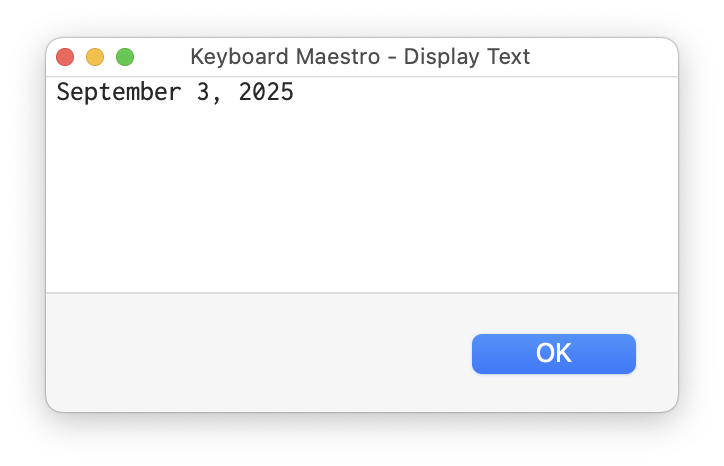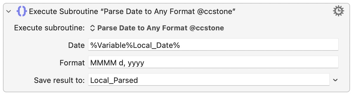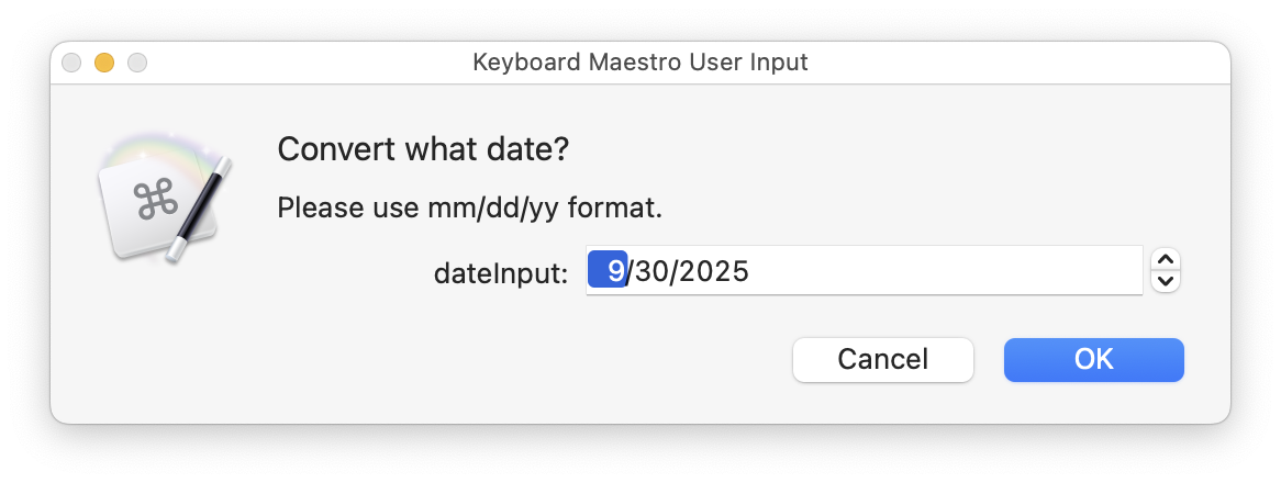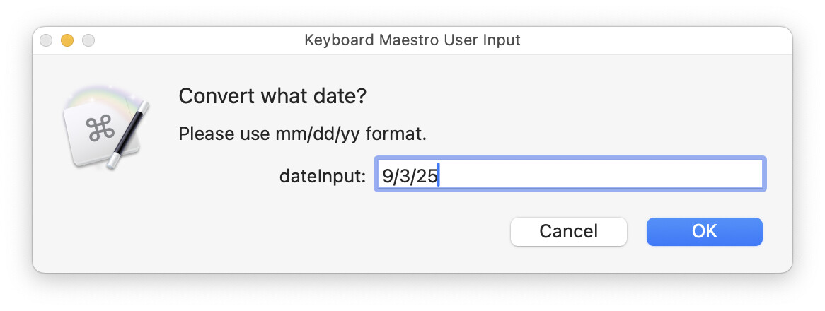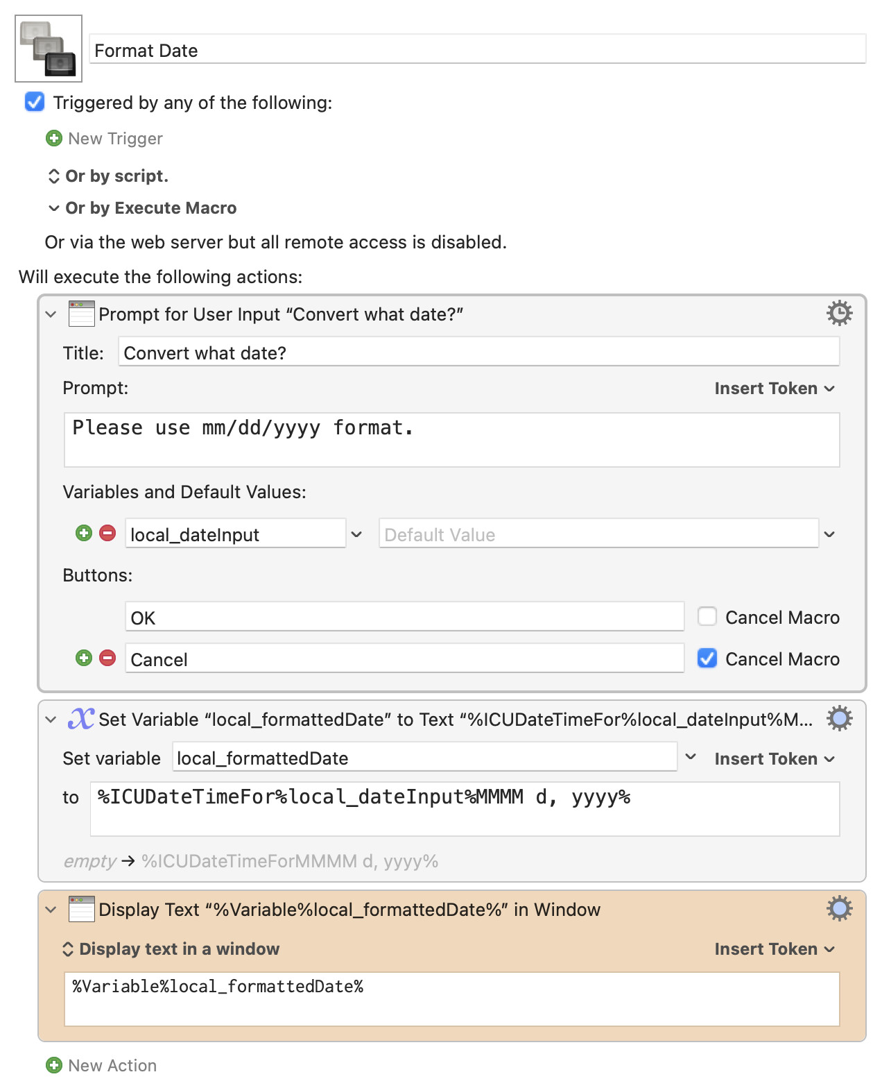 I installed ccstone's subroutine and swapped in the "execute subroutine" action from the Caller Example for my failed attempt with ICUDateTimeFor. So I run the macro and enter the date in the dialog as I designed it: