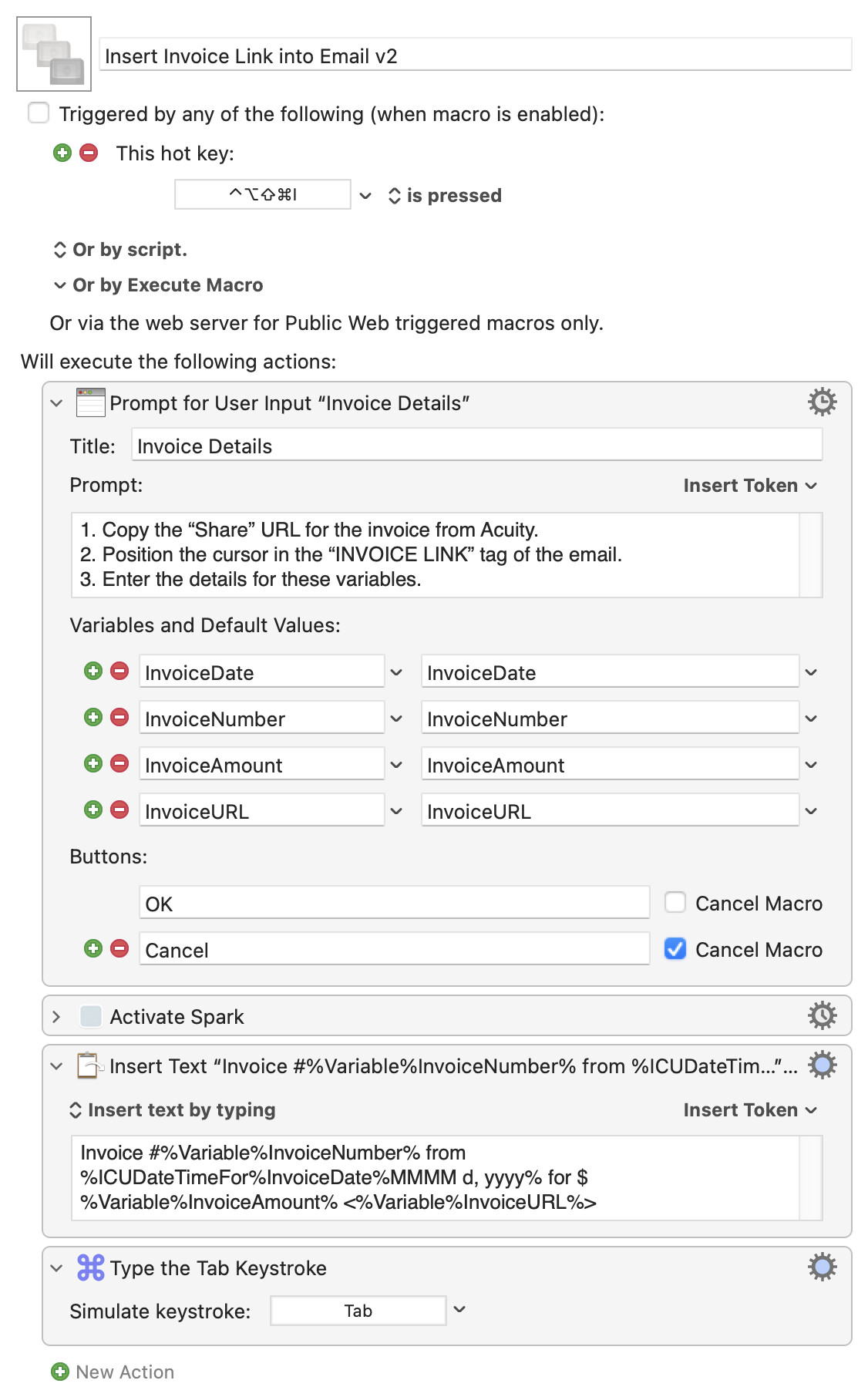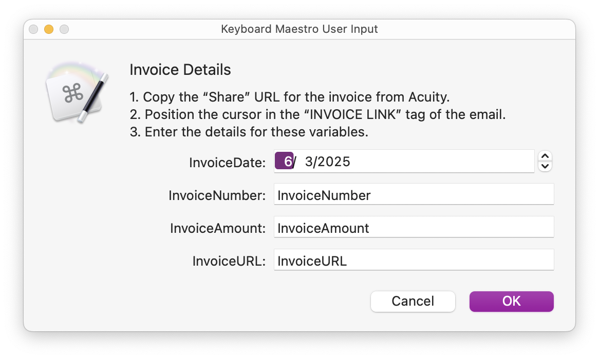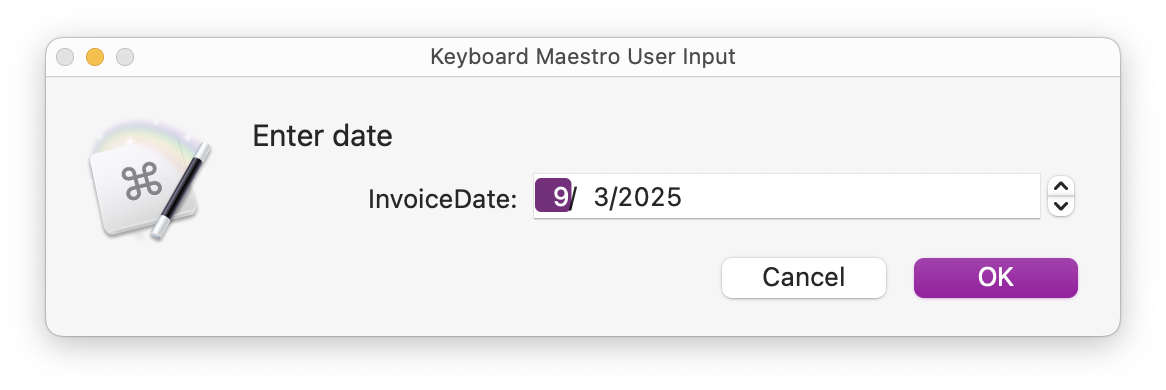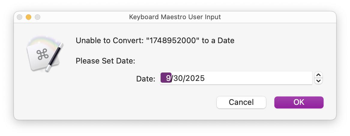 I installed ccstone's subroutine and swapped in the "execute subroutine" action from the Caller Example for my failed attempt with ICUDateTimeFor. So I run the macro and enter the date in the dialog as I designed it:
