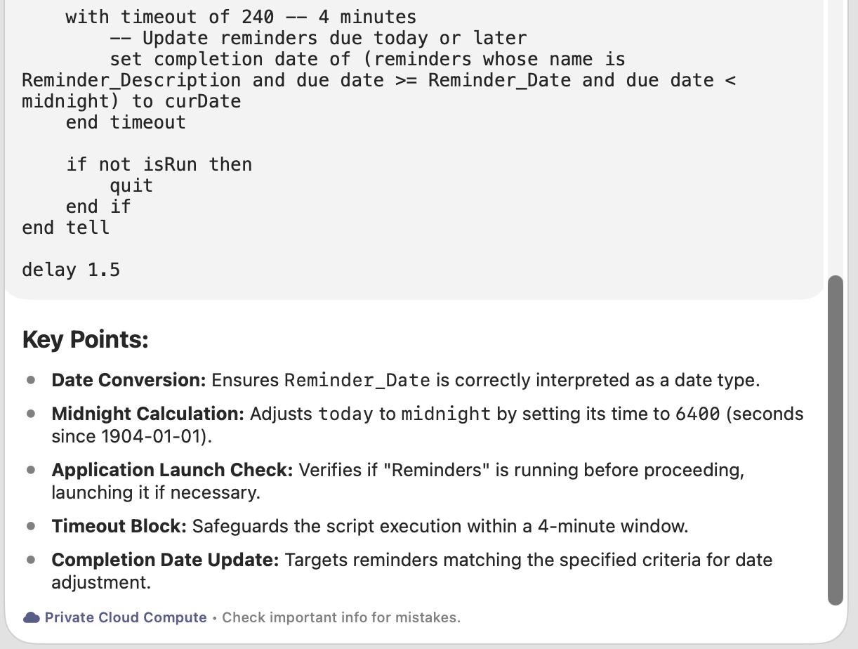 For the PCC-prettified code -- yes, it was re-written in a better way and got most of it right. I'd hope so -- if Apple can't produce valid AppleScript via LLM, what's the point? But even then there was a compilation-breaking mistake. More serious, in my eyes, is the "Midnight Calculation" bit. The explanation is plain wrong, and it never caught that there are quite a few more than 6400 seconds since 1904-01-01.