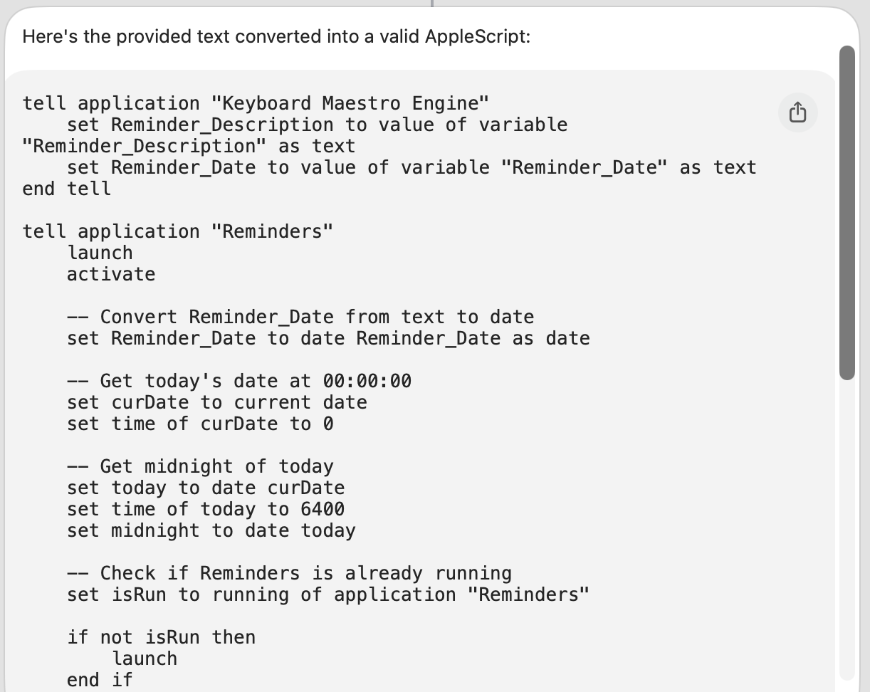 Yes, but here's another trick I use to fix up faulty AppleScript code... I just plop the messy code into a macOS Shortcuts Private Cloud Compute action and get the "fixed" (well-written) code...