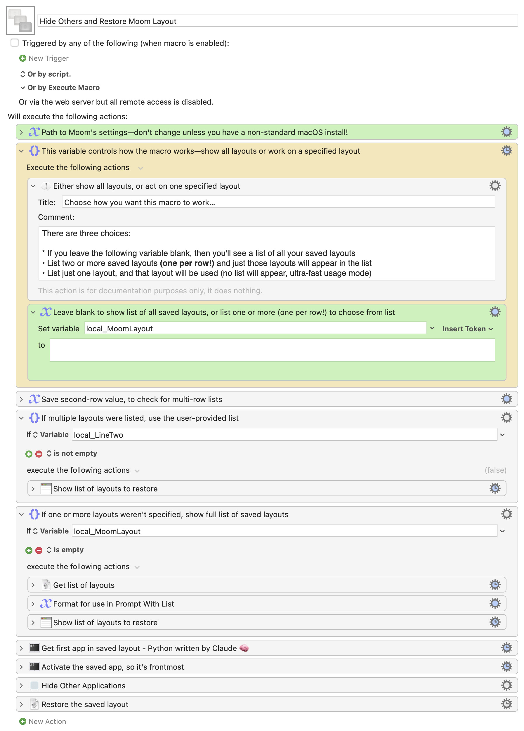 Edit: Forgot to add that this wouldn't have been possible (for me) without some AI assistance: Claude wrote a Python script that parses Moom's settings file to find the apps in each saved layout. It's amazingly fast and made the rest of the macro relatively trivial.