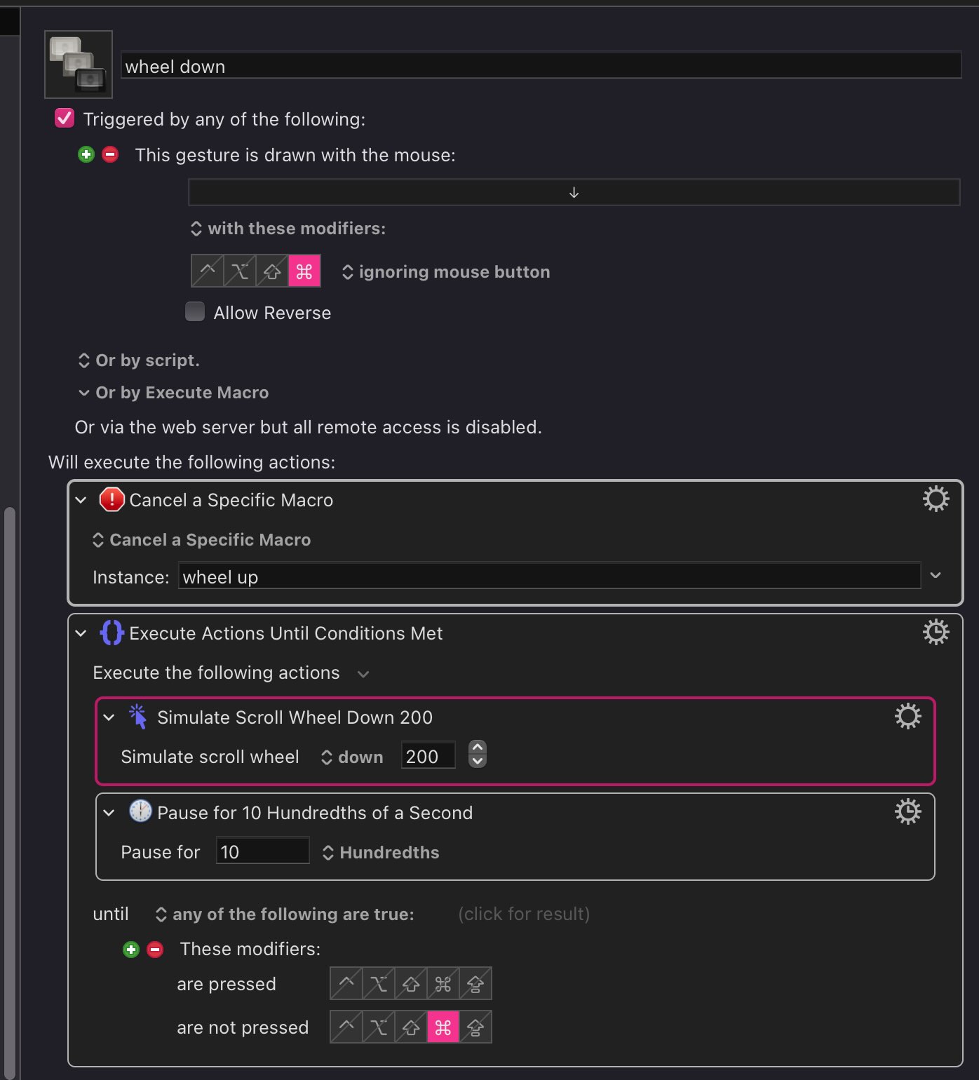 I want to add a wrinkle: if I move the mouse the other direction, I want to exit this macro and execute the mirror macro (wheel up), without having to release the cmd key. It’ll make a seamless action where the cmd key acts as a wheel scroll trigger in either direction until let go.