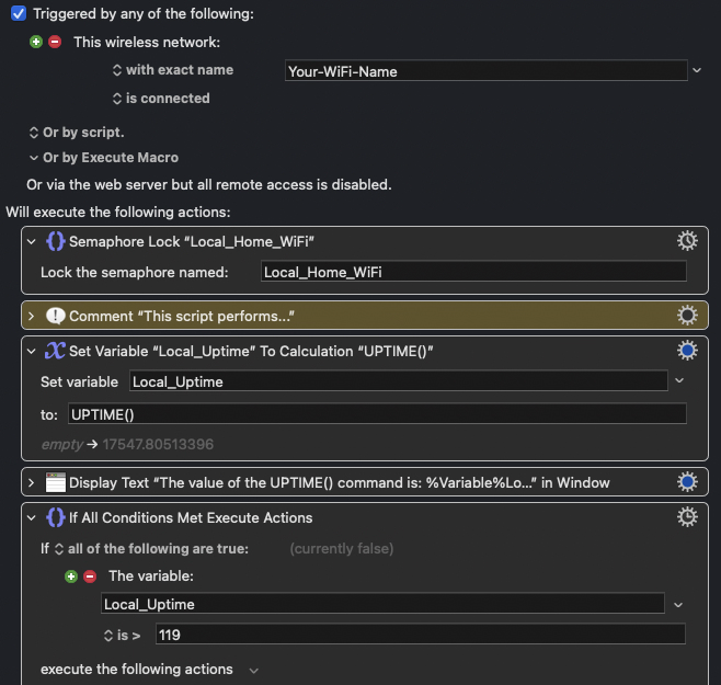 I'm looking for a way to run a macro after a recent macOS reboot activity has settled down using the trigger “This wireless network with exact name is connected”.