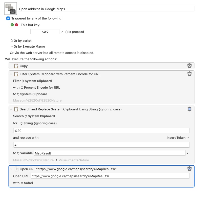 Doing that, it seems to work. This macro assumes you have the address highlighted, then presses Command-C to put it on the clipboard. It then does the above replacements, sets the final URL, and finally opens that URL.