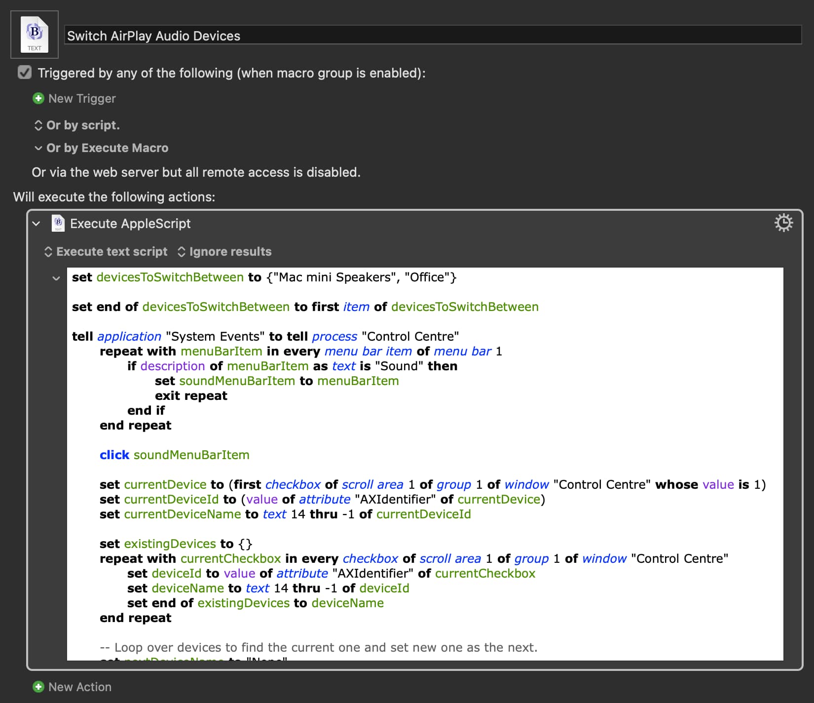 I’ll try Set Sound Output, although it’s not obvious to me how to use it. Also I’m going to have to figure out what all the pieces are. In other words I need to learn more about KM.