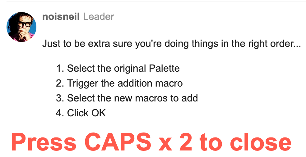 If you are going to update the macro, I would add that the choose macros and press ok user input action is displayed at the top right of my screen underneath the notifications and hidden especially the ok button. I have to drag it out from underneath the notifications to press ok