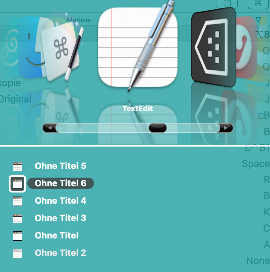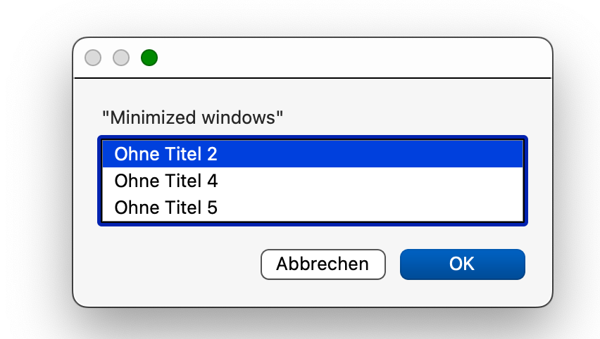 The KM “Windows Switcher” shows all open windows of an app. Is there a way to display only the minimized windows in a list? In this example, that would be only the window named “Ohne Titel 2.”