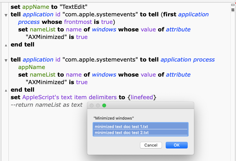 set selectedItems to choose from list (nameList) with prompt "\"" & "Minimized windows" & "\"" default items (aList) with multiple selections allowed