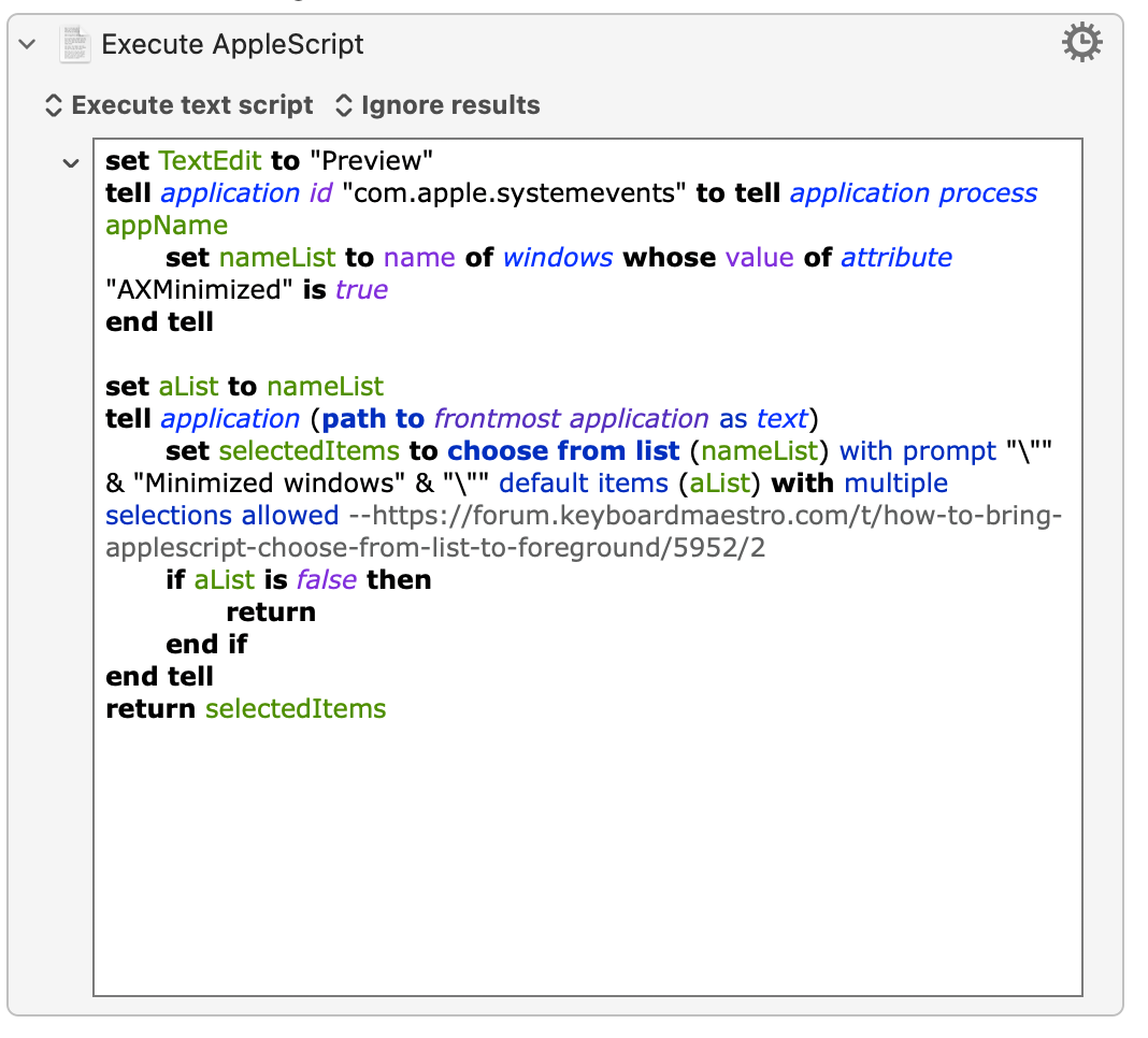 set selectedItems to choose from list (nameList) with prompt "\"" & "Minimized windows" & "\"" default items (aList) with multiple selections allowed --https://forum.keyboardmaestro.com/t/how-to-bring-applescript-choose-from-list-to-foreground/5952/2