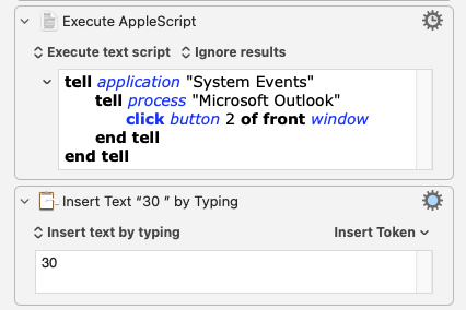 @Nige_S Thank you! You got me on the right track. ignoring application responses didn’t help, but that led me to try KM’s option to run the script Asynchronously. This allowed KM to continue right away to the next macro step without waiting for Outlook. As you point out, it requires a short pause after the AppleScript to allow time for the menu to pop up. It seems that 0.3 seconds is the sweet spot for reliability while getting ride of the perceptible delay.