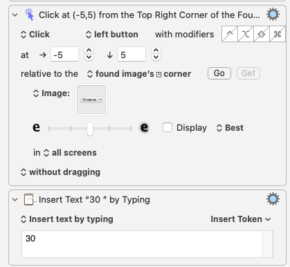 This works very fast (when it works), selecting the “30” line pretty much instantly. The problem is that the Found Image step is not very reliable, no matter how I fiddle with the “fuzziness” adjustment or search image.