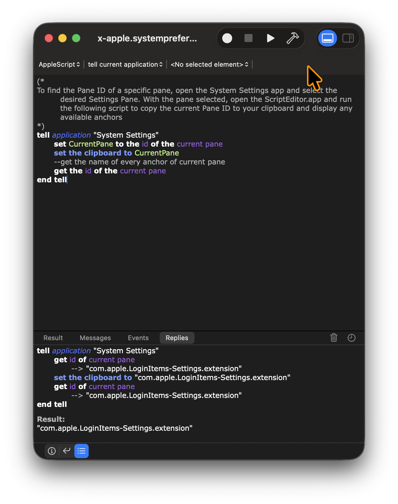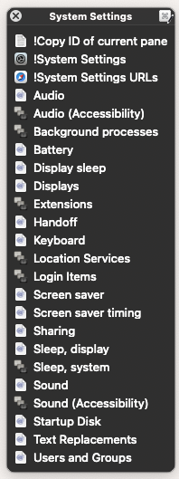 The modern less-friendly System Settings has been out for over three years now and I still have issues finding basic stuff like sleep settings. So I created a group called System Settings with a palette set to show up when a hot key is pressed. Each macro in the group is named in a way that’s natural for me, and consists of an Open URL setting using Apple’s scheme for opening System Settings panels, sometimes followed by an action or two if the URL doesn’t quite open to the right place.