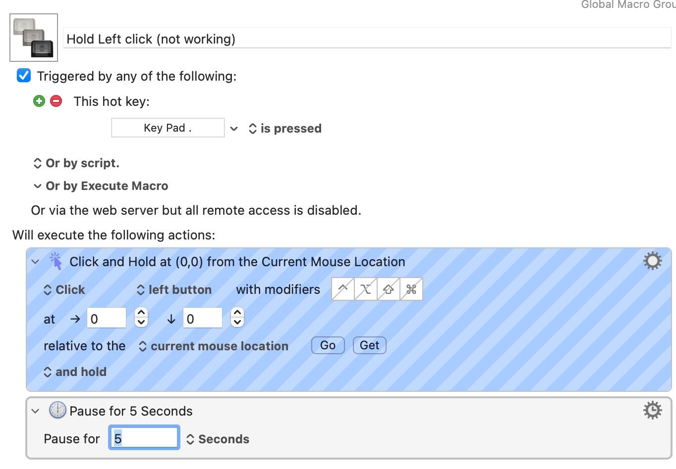 The goal is to get a macro that will click the left mouse button and hold it down so I can do a bunch of stuff using the mouse, then (I guess) click the button again and relese the file I’m dragging. I tried making a Left Click and Hold macros. I saw the note to add a Pause or Pause Until so I added a 5 second delay, but it’s not working well. I did also try the built-in Accessibility option but it allows me to set a switch or trigger for a left/right click, not click-and-hold that I can see.