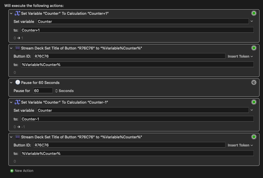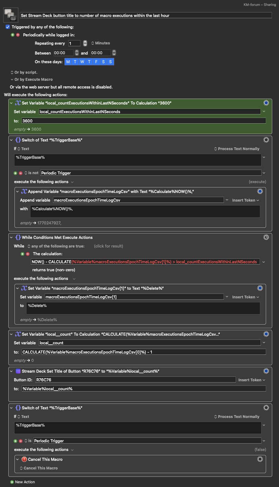 A periodic trigger runs the macro every minute to keep the button up to date. If the macro was triggered by the periodic trigger, the macro ends execution after setting the button to the count. In any other event, it will continue to execute any actions you place below the bottom switch.