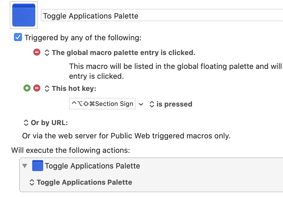 I get that to modify this applescript to work with a Macro pallette you can modify the string "Applications" in your script to be "Macros", I still can't get this to work with a "Show palette of Macros", anything else that needs to be modified?