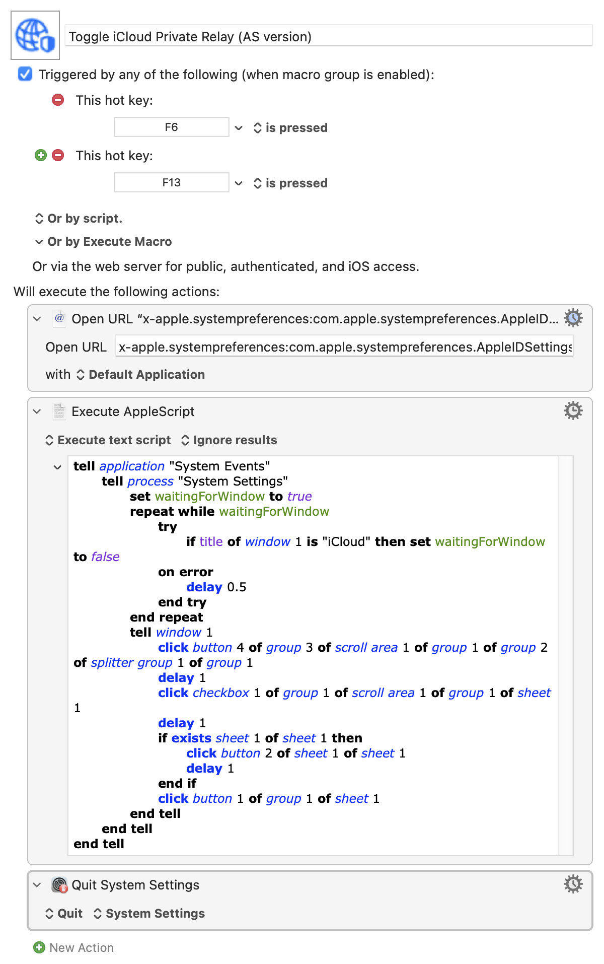 So I wrote a macro that lets you toggle Private Relay on and off with a single keypress or mouse click. It opens the System Settings window and clicks the right buttons to toggle that status; you can see it at work while it is running. You can map this to a single keypress (I use Fn-F6 because of its 'Do Not Disturb' moon icon), or you can trigger it from a menubar icon. I even designed a cute icon for it.