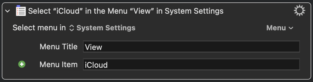 I also tried the Open URL action suggested by @Nige_S but decided to stick with the method I had for opening the iCloud pane. I am using the Select Menu by Name action (System Settings > View > iCloud). This may be new with Tahoe (?).