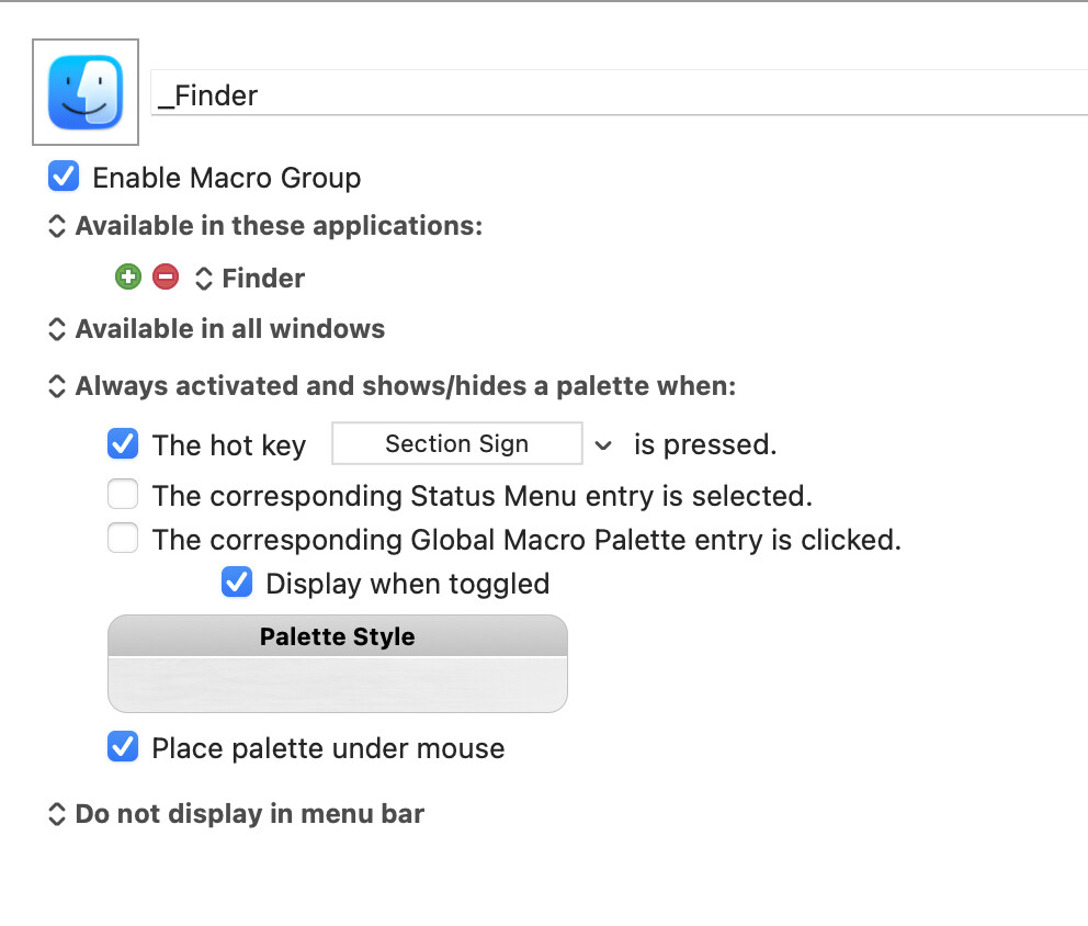 I’ve set up a palette for Finder but can’t quite get it to behave the way I want.