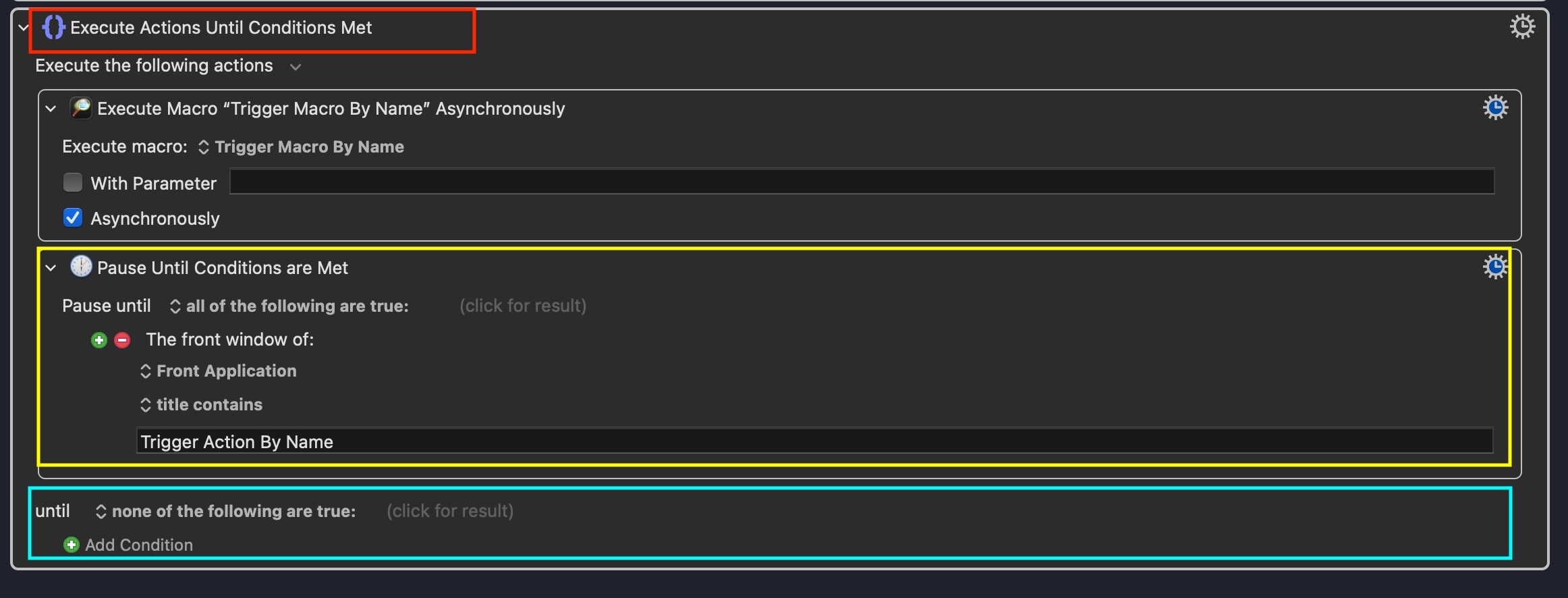 Red Box: I noticed in your above image it reads âExecute Trigger Macro By Name and wait until it is the FRONT WINDOWâ which appears to bind / group the two actions whereas mine just reads âExecute Actions Until Condition Metâ (i.e., the âand wait until..,â is missing). How / why does mine not contain the âand wait untilâŚâ portion and how do I get it to do so? Is this why my macro does not work?