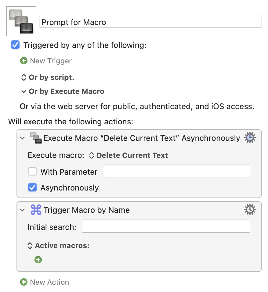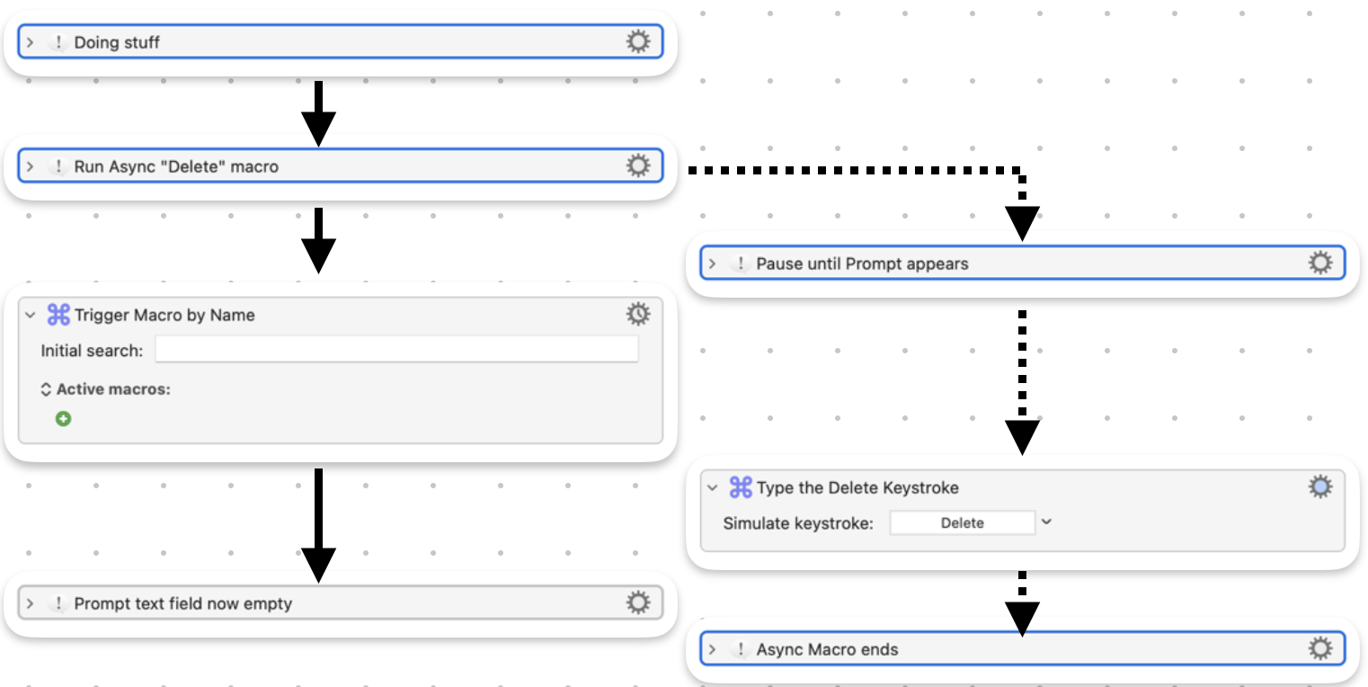So in @JuanWayri's example above, the parent doesn't wait for the child "Execute Macro" action to complete and continues on to the "Execute an AppleScript" action. That waits until the "Trigger Macro by Name" pops its prompt, then exits -- after which the Delete keystroke is simulated, clearing the text from the prompt as that is the currently-active UI element accepting keystrokes.