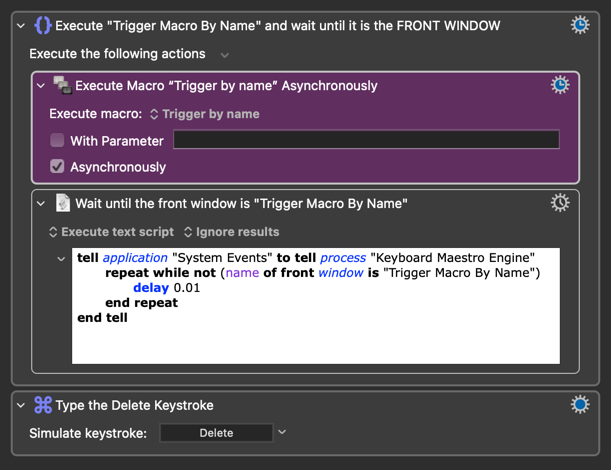 My bad, the previous version didnât get the correct window name. This version does. I updated so that it uses AppleScript to wait for the Trigger Macro by Name window.