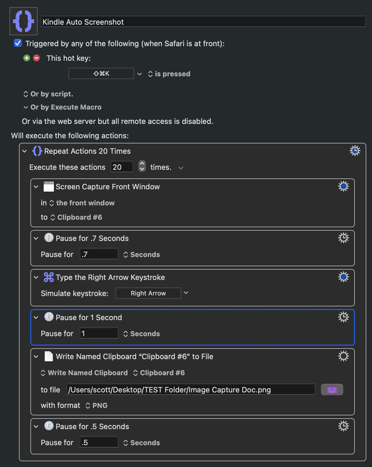 So far I have created a macro that successfully screen captures to a named clipboard the foremost window (safari Kindle reader) and advances to the next page and captures that. I have tried writing the contents of the clipboard to a file both inside the repeat section of the macro and outside ( I assume at the end). Each time I end up with a single file with only the last page captured. I am asking the clipboard to write the file as a png as I thought that would be the most straight forward.