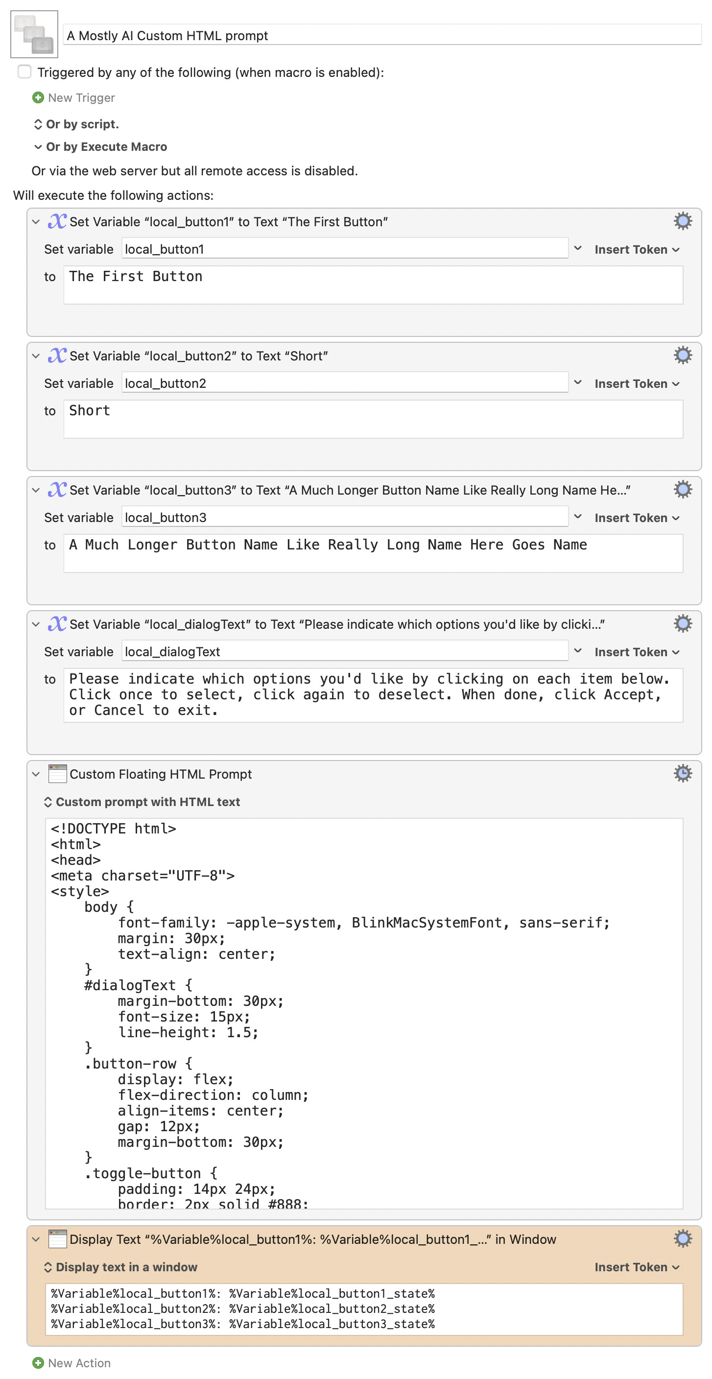 The first version didn't quite work, but was closeβthe button names were blank, which meant something was wrong with the variable names getting passed into the script. Pretending that I knew nothing of custom HTML prompts, I searched the Keyboard Maestro forums for topics related to passing variables to custom HTML prompts, and found this discussion, which included the right way to do it. I told ChatGPT the right method (the one line of JavaScript), and it revised the script. The prompt now worked fine, but the window sizing was wrong, and the button shading was wonky.