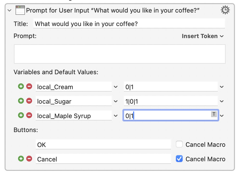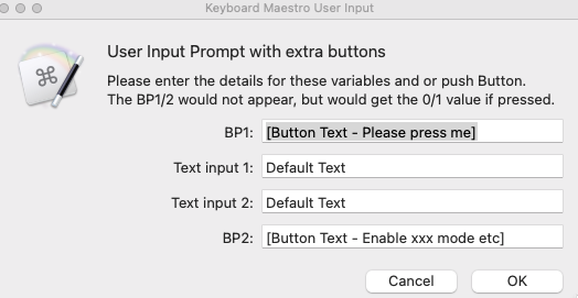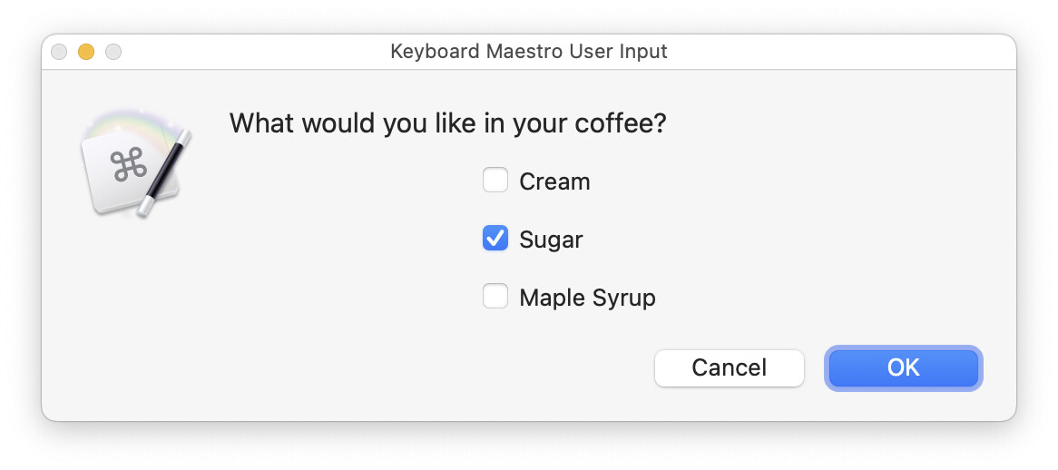 At the bottom, a Cancel button dismisses the prompt without returning anything, and an Accept button returns the button states for the three buttons to Keyboard Maestroβif they've been clicked into an active state, they should return On, otherwise Off.