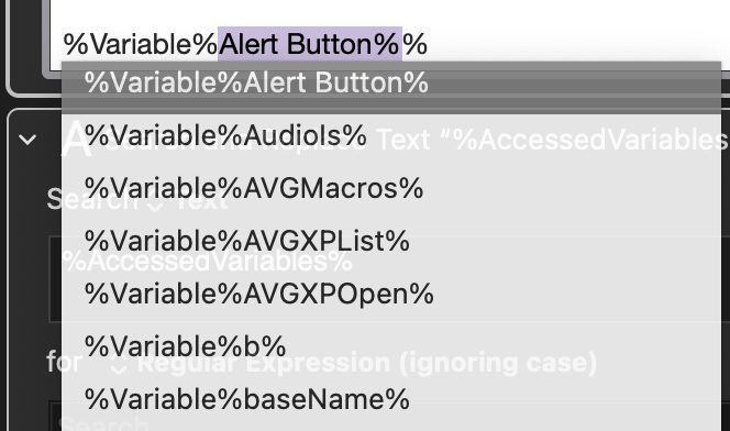I think I managed to figure out how I was opening it. After inserting the variable token, I move the cursor one step back in order to ⇧⌥LeftArrow to select VarName and open the variable selector to search all variables by name, which is what this menu seems to be as well, but in-line. It appears that with the cursor next to the second % inside the variable token or any letter thereafter, this menu drops down allowing for scrolling with mouse or keyboard. Typing any characters will filter the list down accordingly.