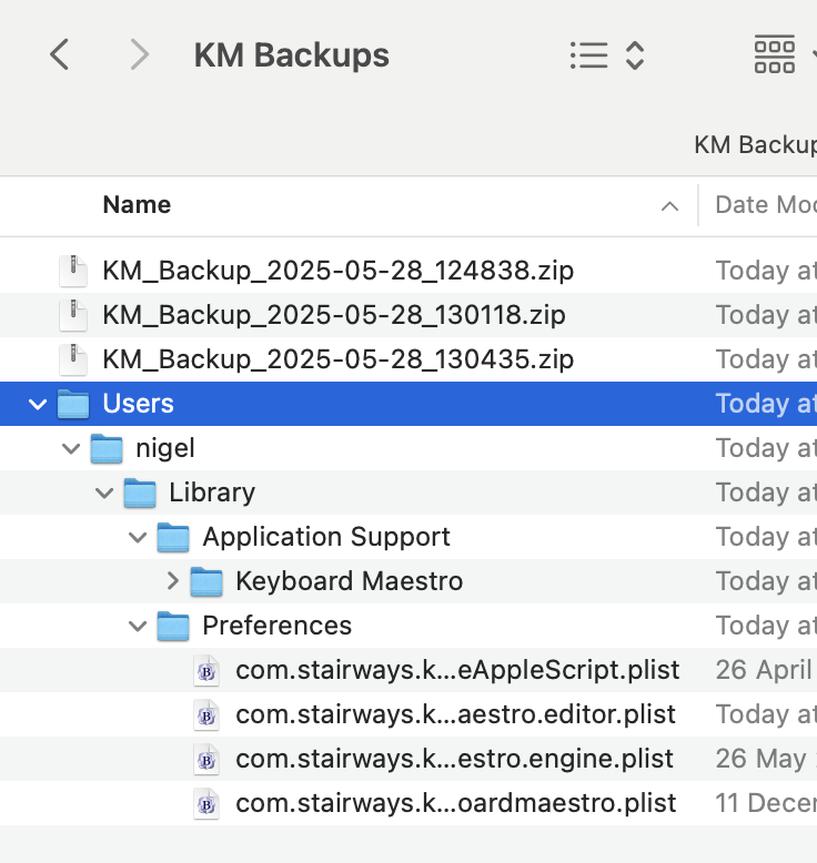 Here's the result, also showing what you get after unzipping a backup file (I've left the "Keyboard Maestro" folder closed):