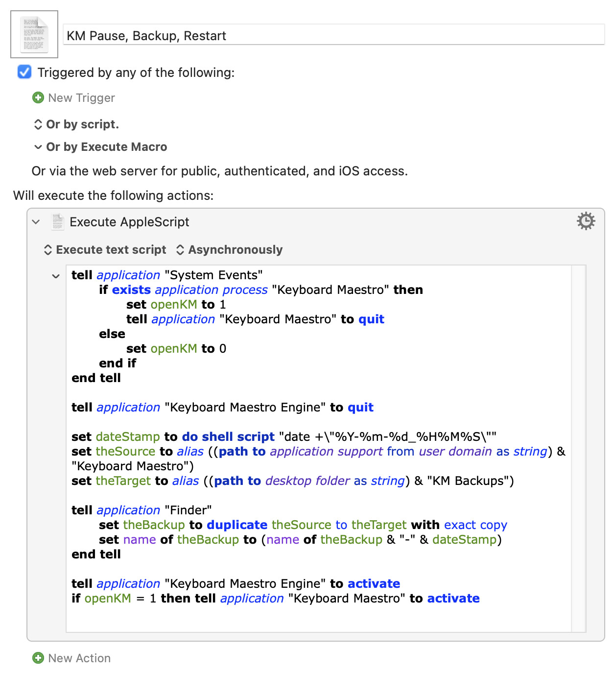 -backup * ~/Library/Application Support/Keyboard Maestro folder and ~/Library/Preferences/com.stairways.keyboardmaestro.* files to a (in my case) non dropbox folder - ZIP backup files and add date time stamp